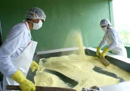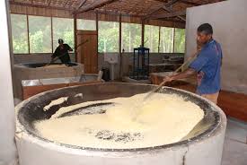 A produção de farinha de mandioca, o mais importante dos sub-produtos da planta, era um trabalho essencialmente feminino. Depois de arrancar as raízes, as índias ralavam o alimento em uma espécie de prancha de madeira cravejada de pedras pontudas. A massa resultante era então passada no tipiti, instrumento de tranças vegetais feito pára escoar a manipueira (caldo venenosa pela presença de ácido cianídrico), e levada a grandes panelas de barro sobre o fogo.
